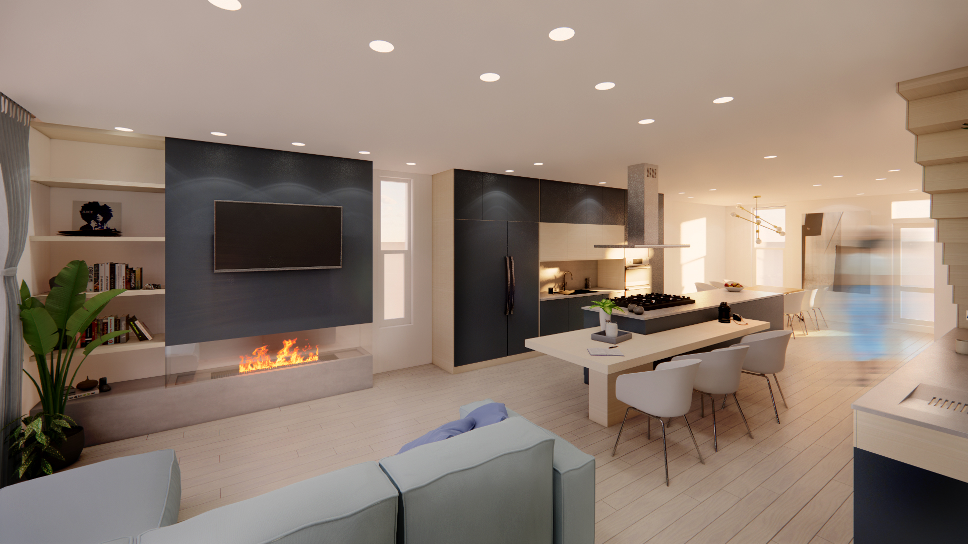 Pour ce couple passionné de cuisine, l'espace au rez-de-chaussée est entièrement ouvert autour de la cuisine centrale. Ils désiraient un espace sans obstacle, baigné de lumière naturelle, tout en intégrant les plaisirs technologiques modernes dans leur maison.